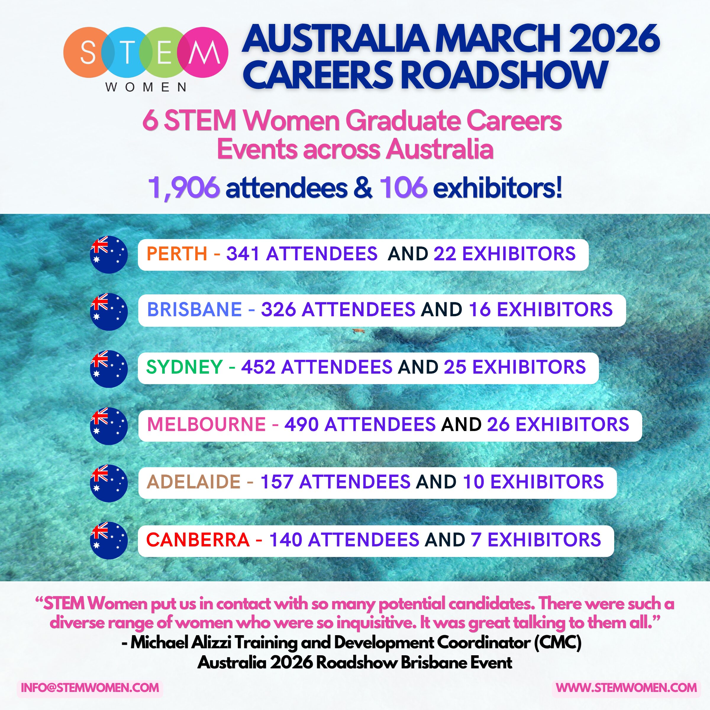 “STEM Women put us in contact with so many potential candidates. There were such a diverse range of women who were so inquisitive. It was great talking to them all.” – Michael Alizzi Training and Development Coordinator (CMC) Australia 2026 Roadshow Brisbane Event